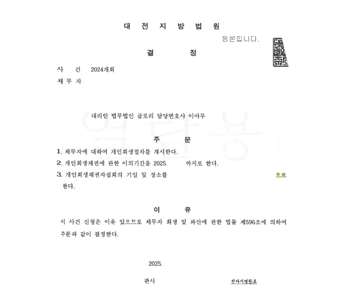 이렇듯 저희 법무법인 글로리는 고객님과의 꼼꼼한 서류 준비와 신청을 통하여 계속하여 유리한 방향으로 사건일 진행될 수 있도록 다방면으로 방안을 찾아나가고 있으며, 좋은 조건으로 개시결정까지 받을 수 있도록 최선을 다하고 있습니다.