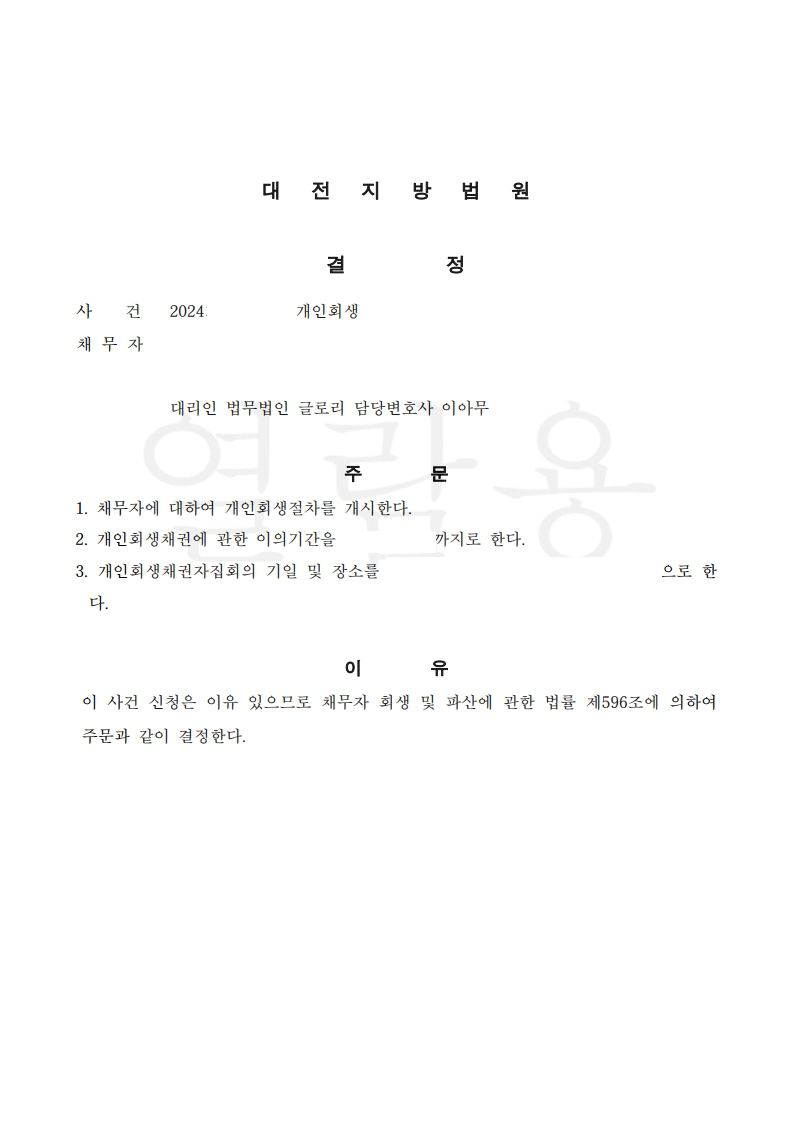 의뢰인의 어려운 상황을 이겨내실 수 있도록 저희 법무법인 글로리가 신청부터 최선을 다하여 노력하였습니다.