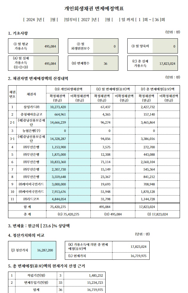 5. 법원의 요청서류를 적극반영하여 36개월에 50만원이 안넘는 변제금으로 개시결정을 받을 수 있었습니다.