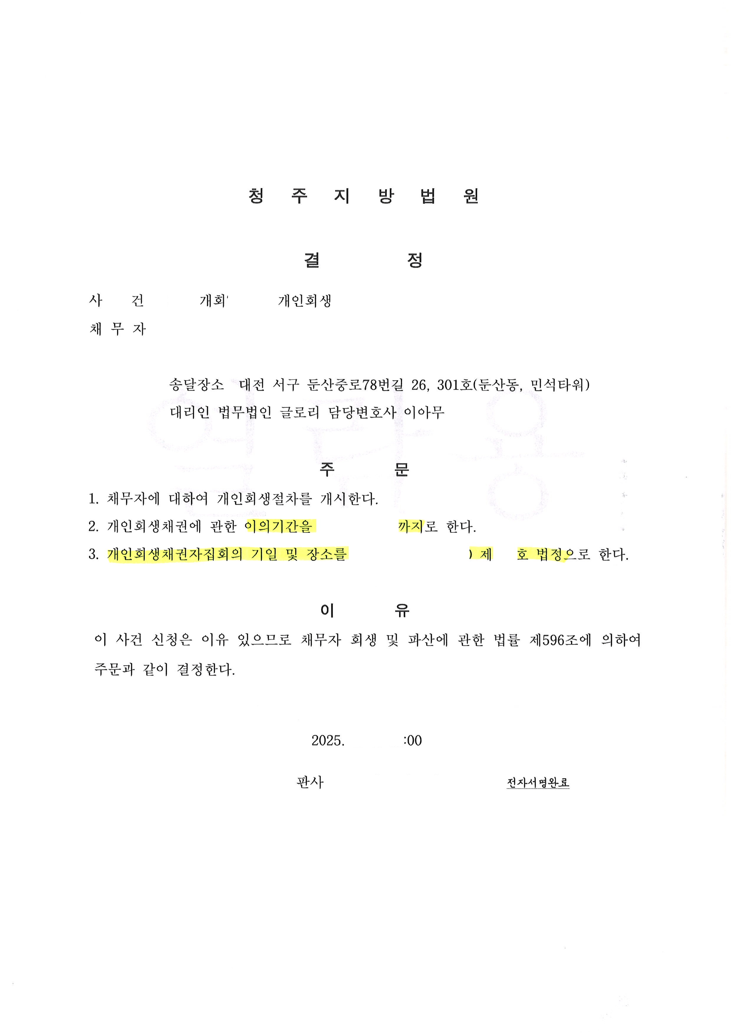 그결과 변제율 32.4% 월 변제금 233,752원이라는 좋은 조건으로 개시 결정까지 받을 수 있었습니다.