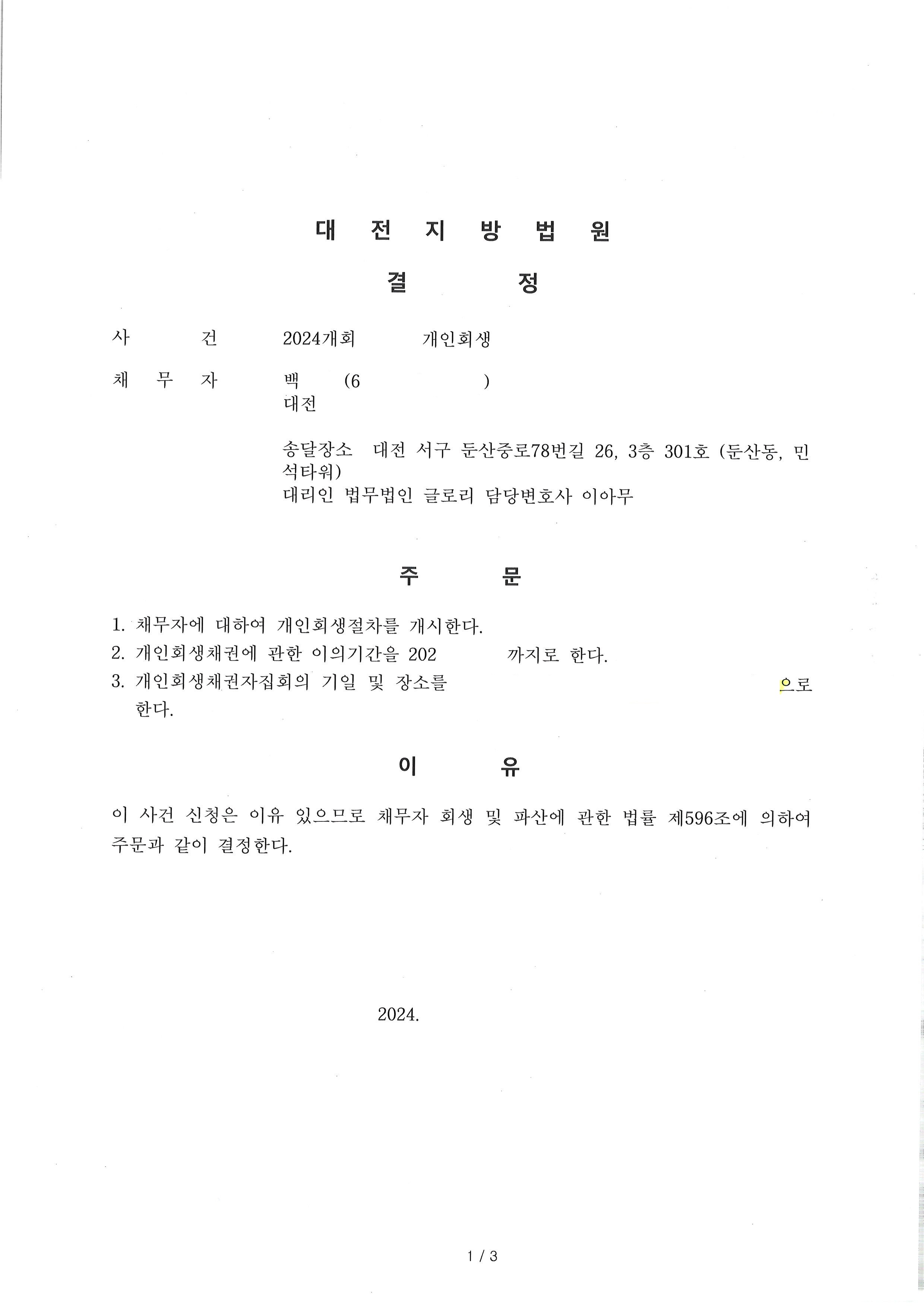 회생사건 재신청인임에도 불구하고 글로리의 철저한 서류 준비와 설득력 있는 소명자료 제출을 통해 개시결정을 이끌어낼 수 있었습니다. 특히 전체 채무 대비 변제율은 23.6%로, 고령의 신청인이 현실적으로 감당 가능한 수준의 회생 조건이 성립되었습니다.