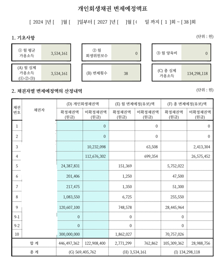 의뢰인께서는 담보부 회생채권 약 2억 5천만 원, 무담보부 회생채권 약 5억 9천만 원, 총 771,501,805원의 과중한 채무를 부담하고 있었습니다. 과거 두 차례 회생 신청이 기각된 이력이 있었기에 이번 사건은 세심한 접근이 요구되는 재신청 사건이었습니다.