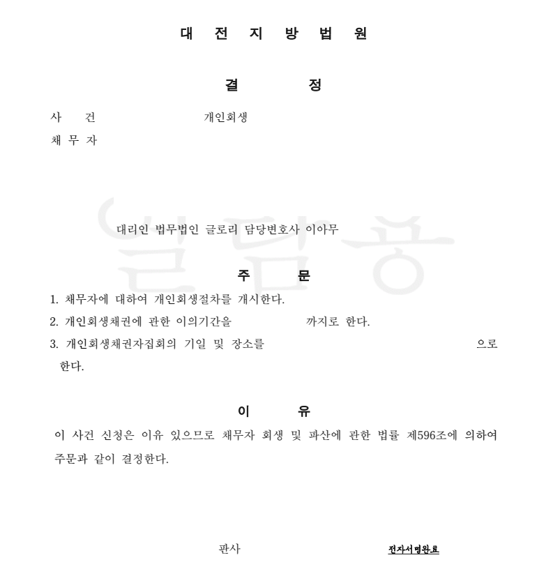 그 결과, 법원은 저희의 주장을 받아들여 추가적인 보정을 요구하지 않고 변제율 26.6%로 최종 확정하였으며, 채무자가 무리하지 않고 성실히 상환할 수 있는 조건에서 개시결정을 이끌어낼 수 있었습니다.