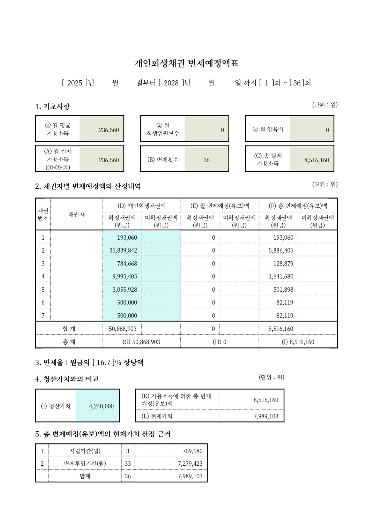 이 결과 총 채무액 약 7천900만원에서 8백50만원을 변제하는 것으로 결정 받을 수 있었으며 , 월 변제금 20만원 초반대 , 변제율 16.8%로 사연자는 36개월간 안정적으로 채무를 변제할 수 있는 좋은 결과를 얻을 수 있습니다.