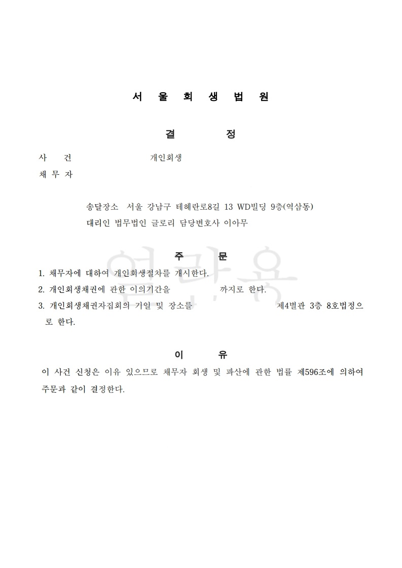 다만 고객님께서 배우자와 장기간 별거 중인 상황으로 관련 서류 발급이 어려웠던 부분에 대해서는, 그 사정을 구체적으로 정리하여 법원에 소명하였고, 이 내용들이 받아들여 무사히 개시 결정을 받을 수 있었습니다.