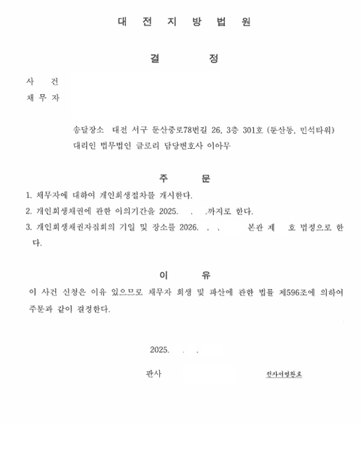 결과적으로 요청한 추가 생계비도 인정을 받았고, 월변제금과 낮은 변제율로 보정 없이 개시결정을 받았습니다.