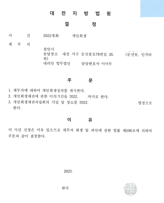변제율 9%수준의 나이스한 결정을 받아드릴 수 있었습니다.