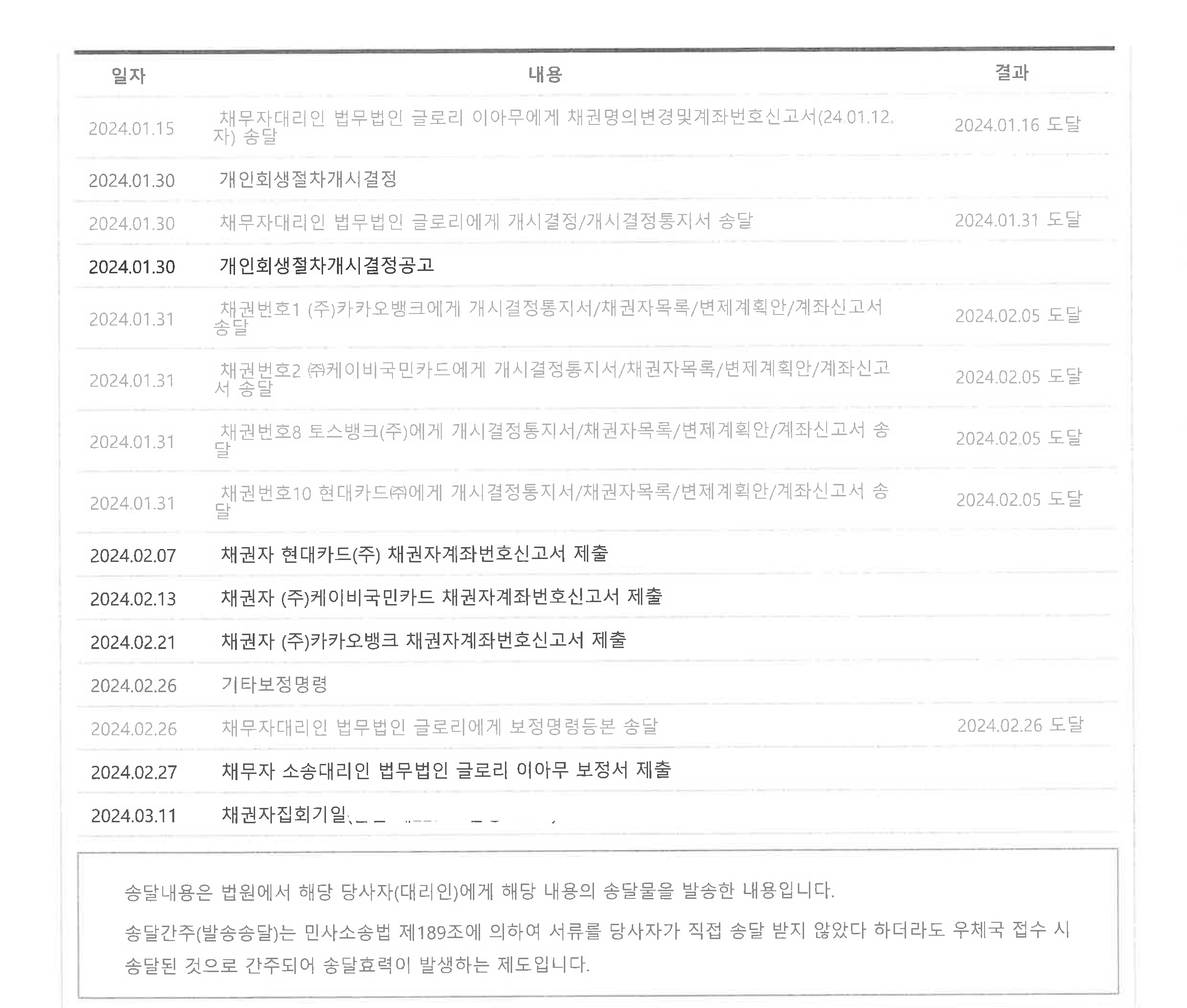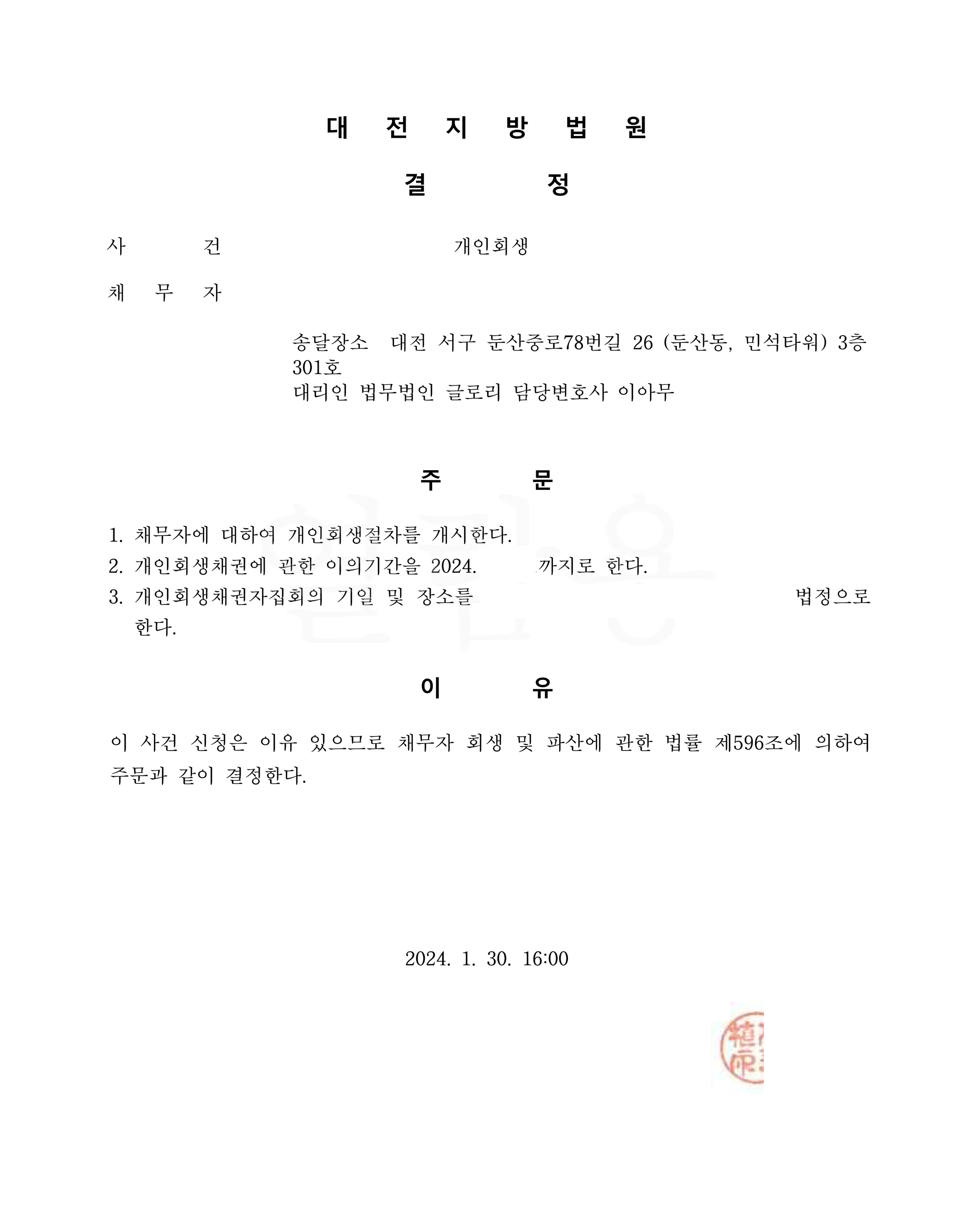 신청서의 제출부터 서류를 완벽하게 준비하여 제출한 결과 1차례의 보정도 없이 개시결정을 받을 수 있었습니다.