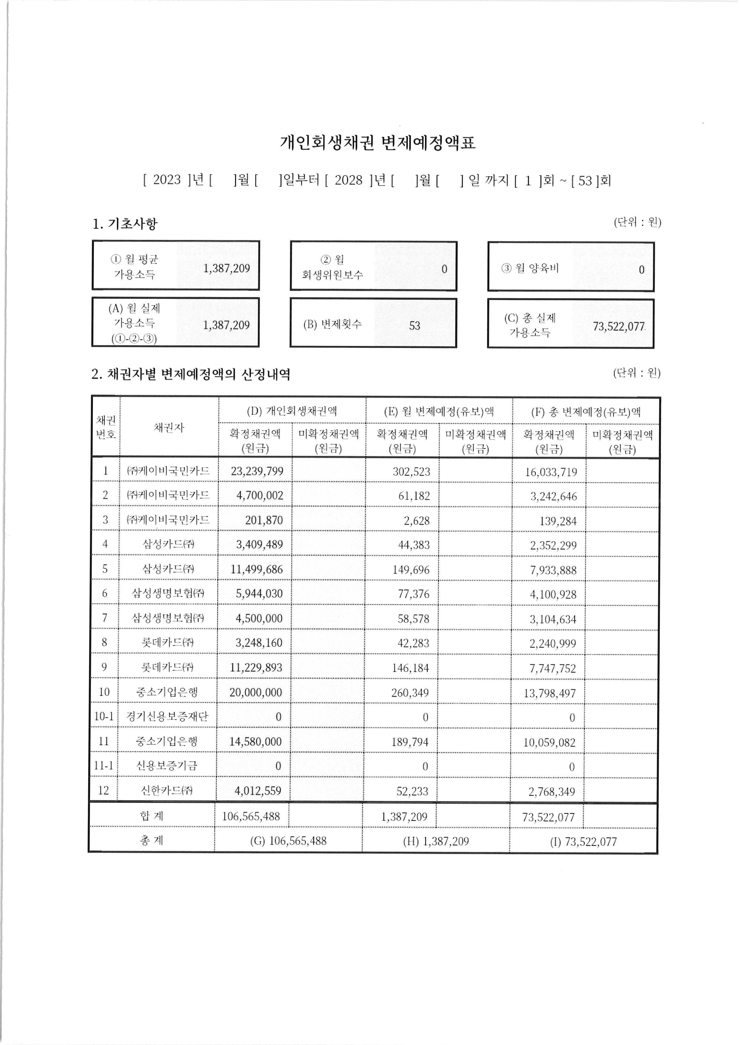 개인회생이 진행가능하도록 소득을 계산하였습니다.