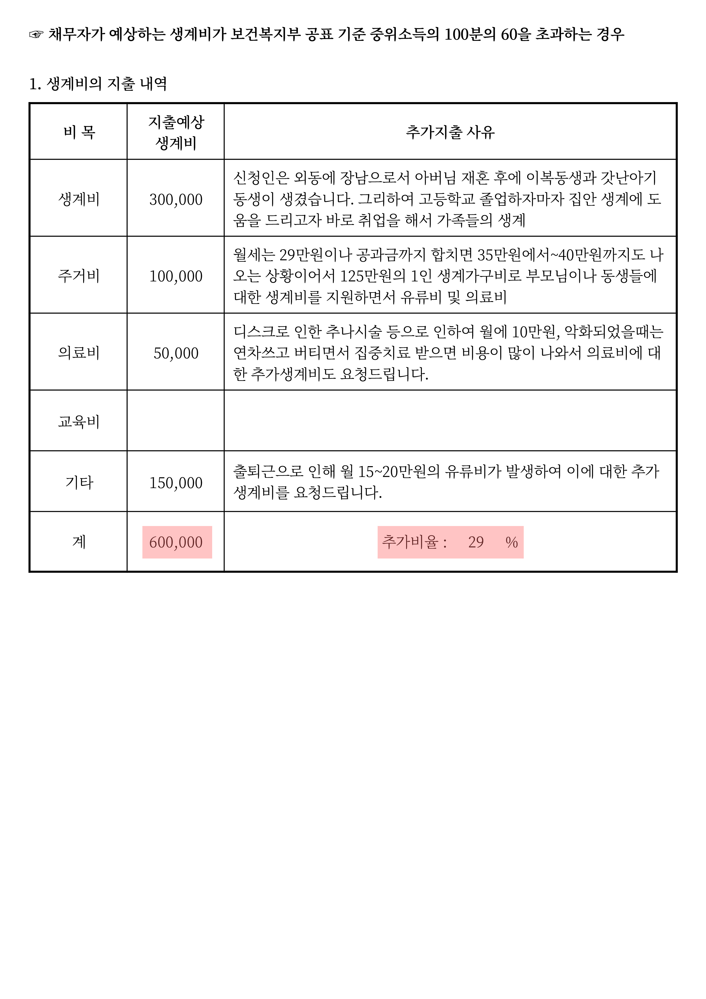 이에 총 추가생계비 60만원을 인정 받았습니다.