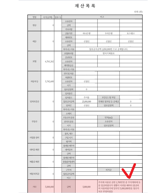 그 결과 주식, 코인으로 생긴 채무 17,000,000원 중 생활비로 사용된 금원을 소명하였고,