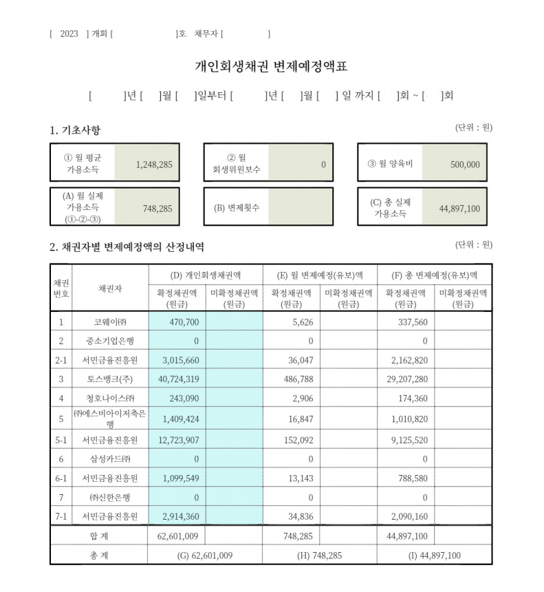 준비하여 제출했고, 월변제금에서 양육비 지출을 인정받아 월 변제금을 70만원으로 줄일 수 있었습니다.