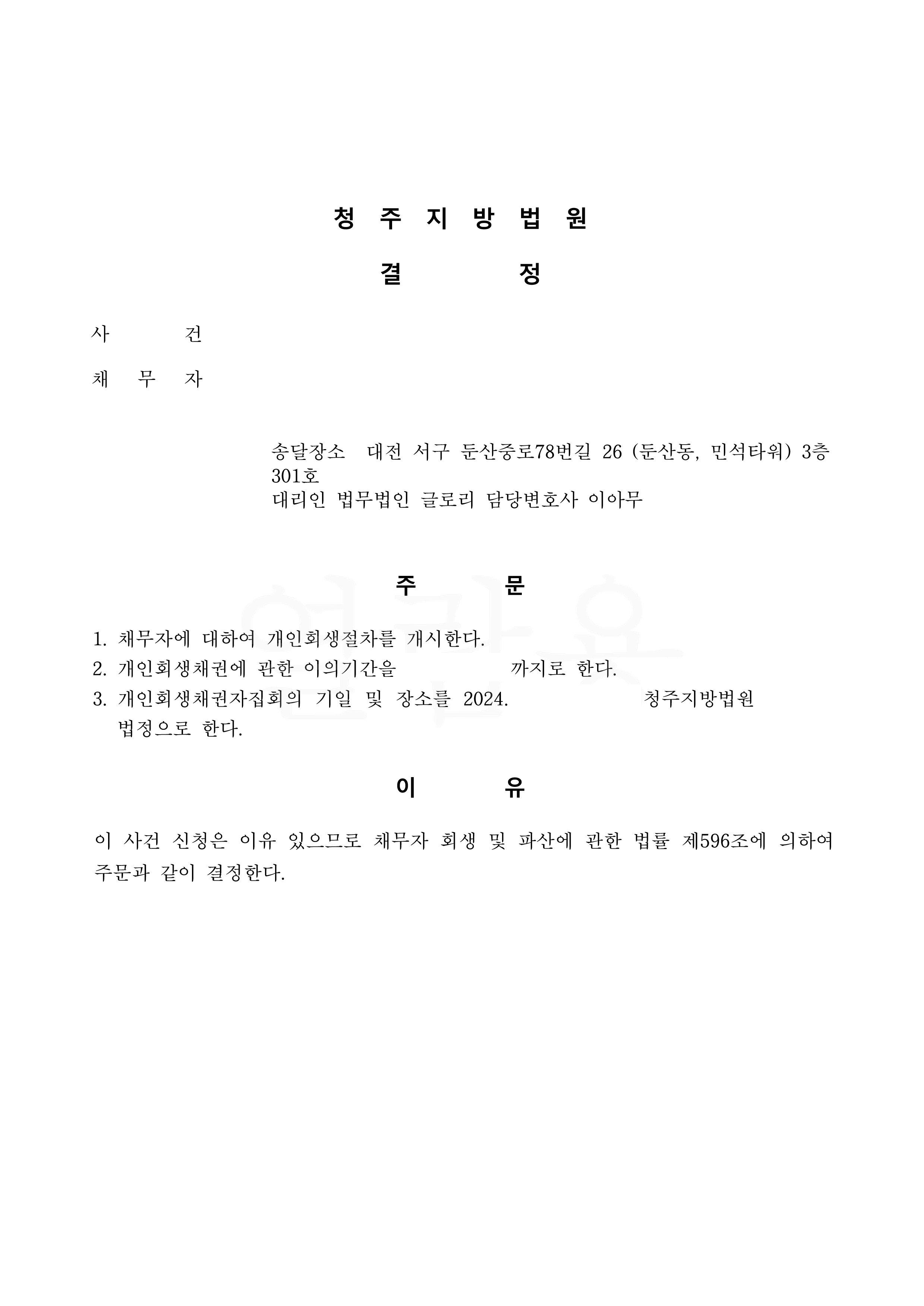 월 변제금 98만원, 변제율 48%라는 좋은 조건으로 개시결정을 받을 수 있었습니다.