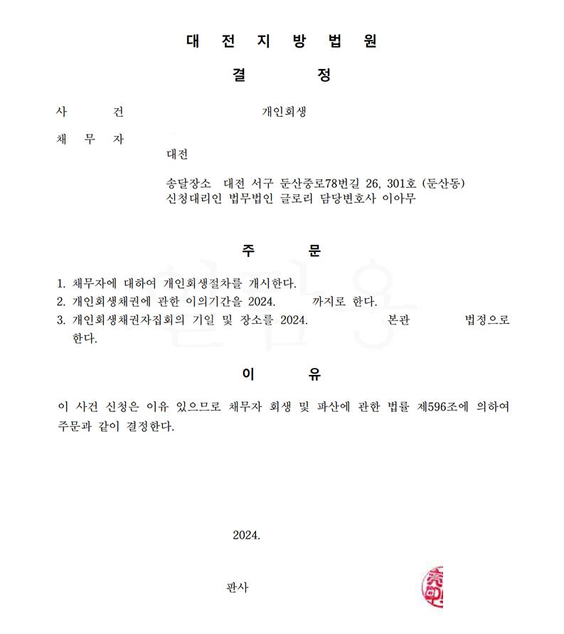 신청인 김승환(가명)님께서도 매우 만족하는 좋은 결과로 개시결정을 받을 수 있었습니다.