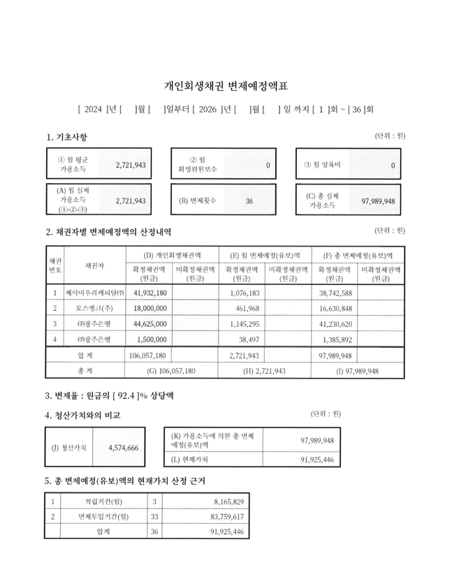 높은 소득으로 변제율이 높아 상여금을 지급 받지 못한 달까지 평균으로 산정할 경우 신청인이 매월 납부해야하는 변제금이 급여를