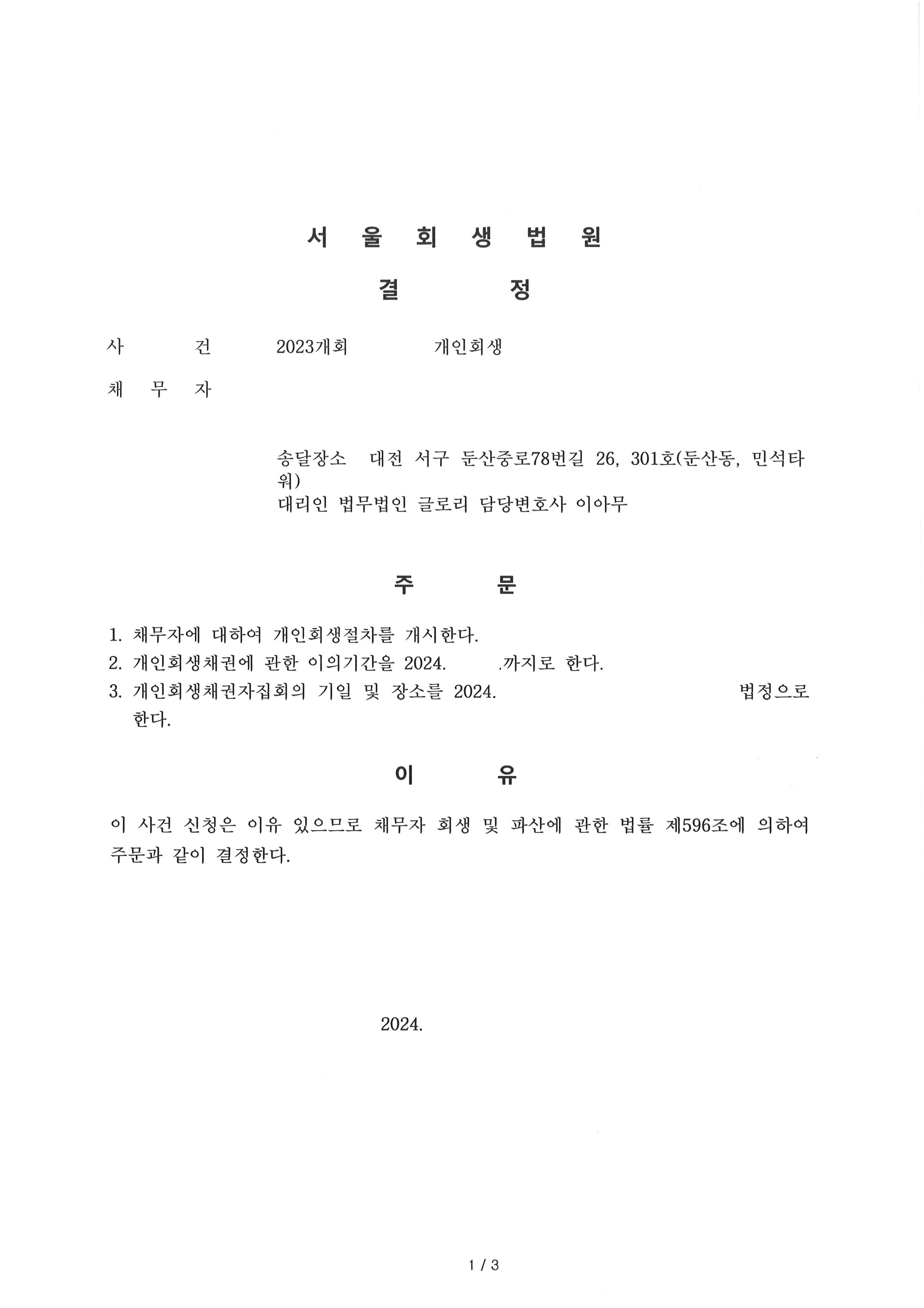 원금의 40%에 가깝게 탕감 받는 좋은 결과로 개시결정을 받을 수 있었습니다.