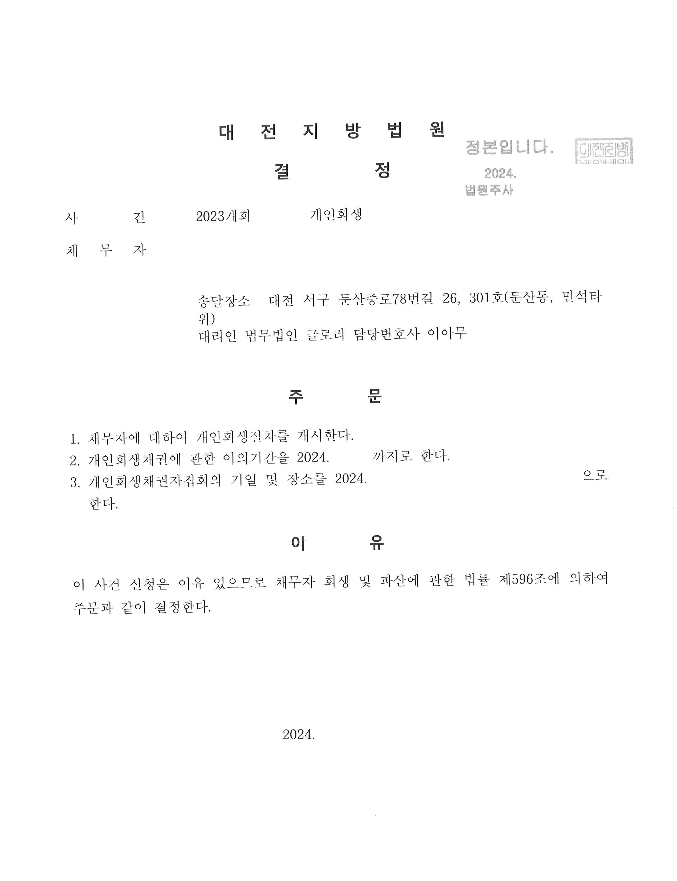 저희 법무법인 글로리는 김정우(가명)님의 힘든 상황을 고려하고, 다시금 아픔이 반복되지 않도록 또한, 최소한 변제금으로 변제를 도와드릴 수 있도록 노력하였습니다.