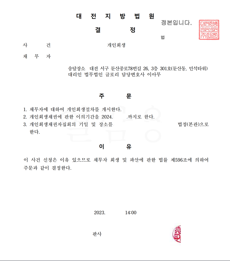 법무법인 글로리를 통해서 개인회생을 신청하게 되었습니다.