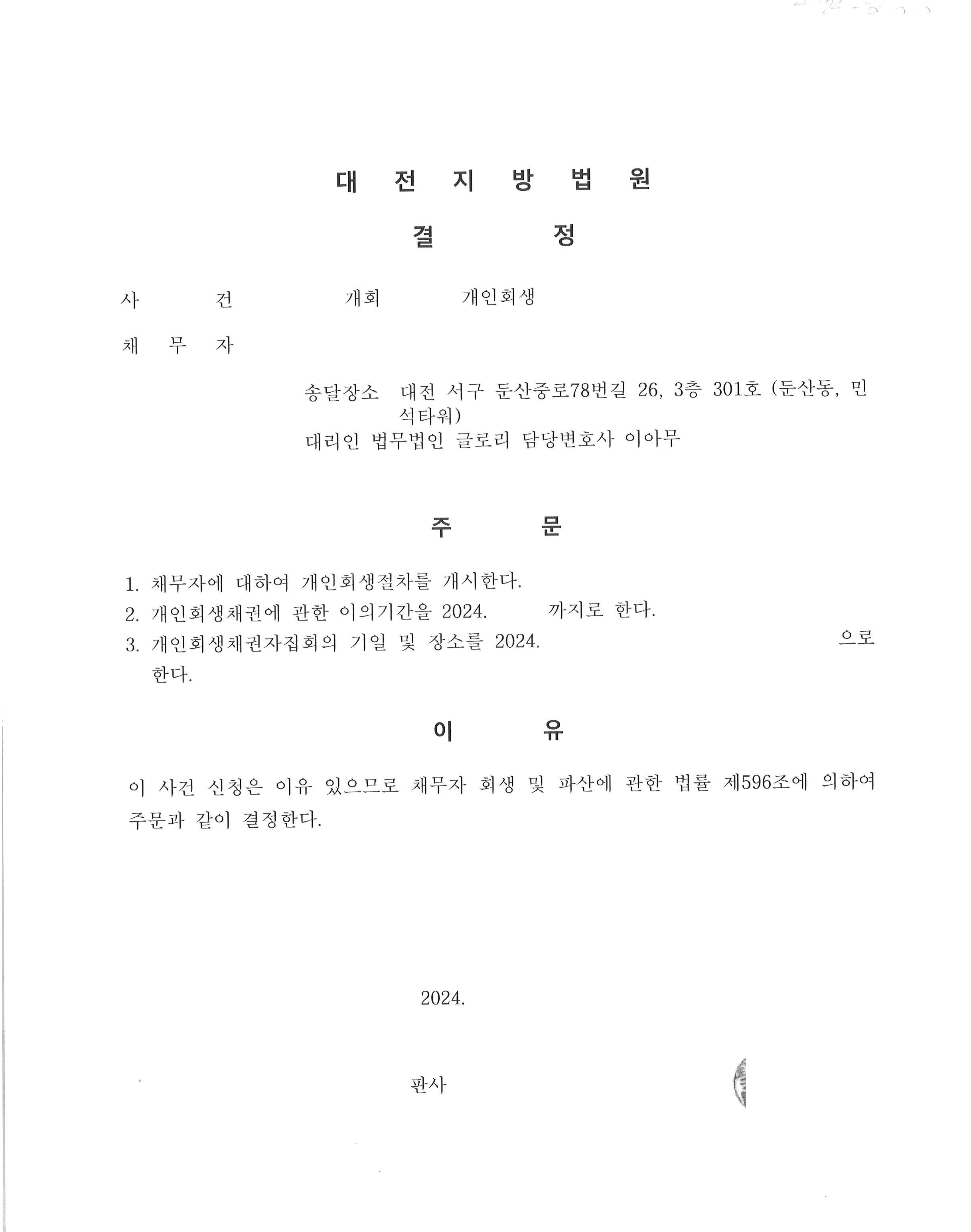 고객님께서도 매우 만족하는 좋은 결과로 개시결정을 받을 수 있었습니다. 소득이 높은 편이라 월 변제금이 부담스러워 개인회생을 고민하고 계신다면