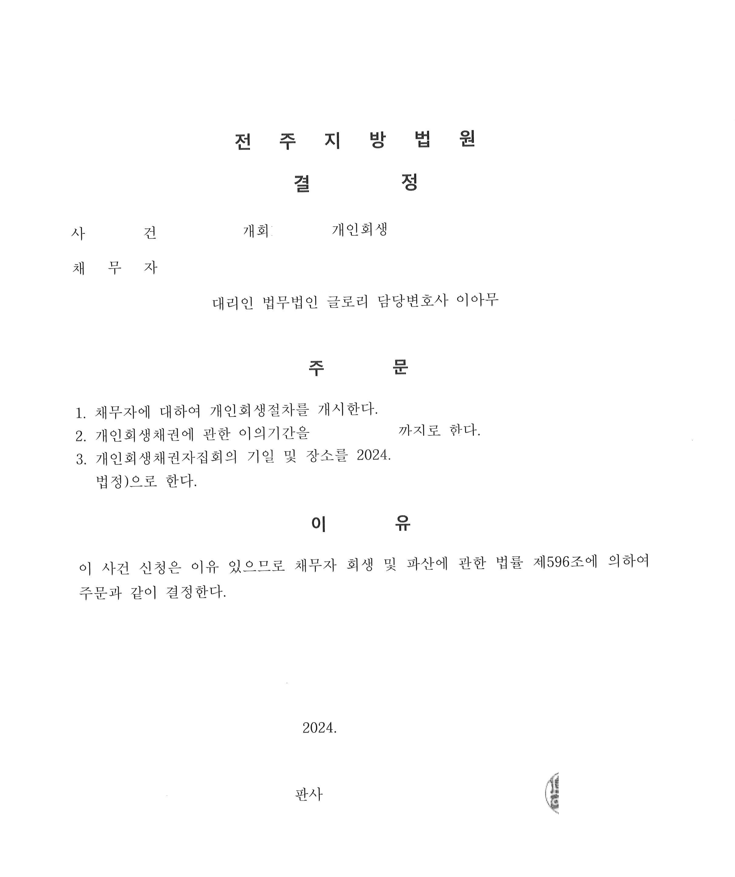 월 약 95만원 정도의 변제금, 탕감율 53.7%의 변제계획안에 대하여 개시결정을 받아낼 수 있었습니다.
