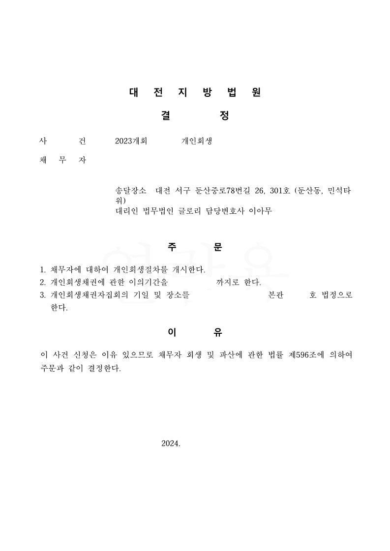 이러한 결정을 받게 된 김 모씨는 너무나 만족해하셨고, 꾸준히 변제하며 앞으로 새로운 삶을 살 수 있을 있을 것 같다며 희망이 생겼다는 뿌듯한 후기를 받았습니다.