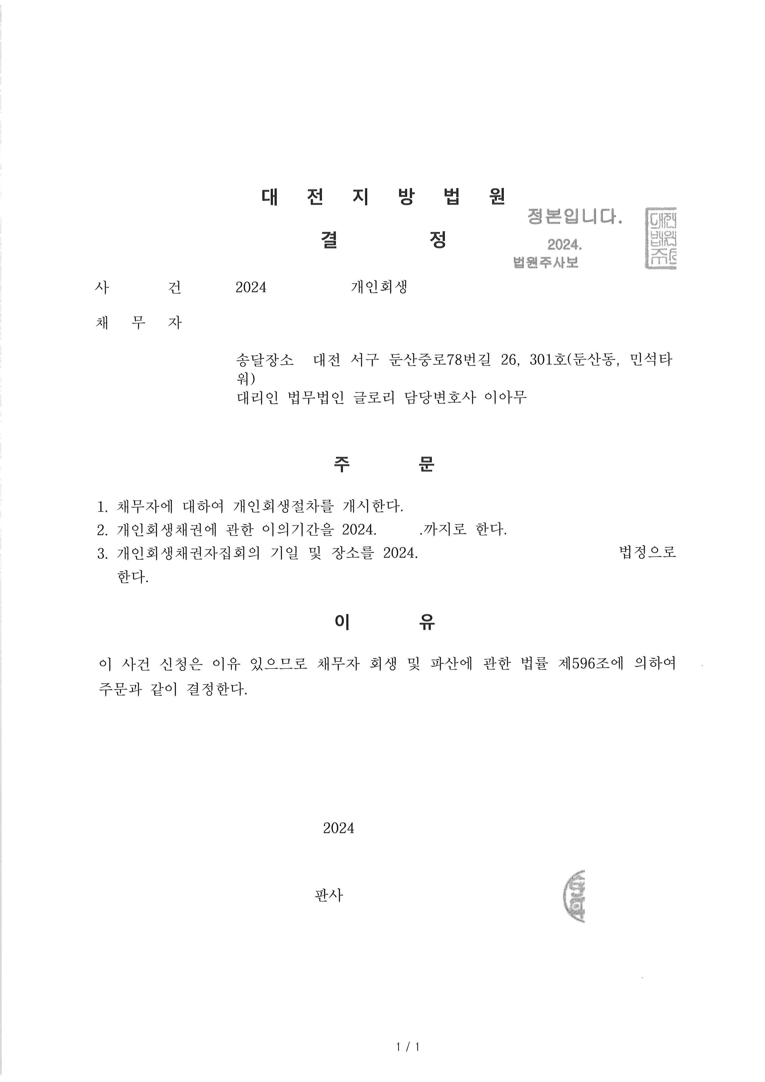 이후 추가보정없이 바로 개시결정 받을 수 있었습니다.