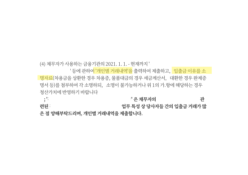 법원에서는 개인별 거래내역을 정리하여 소명하라는 보정이 나왔습니다.