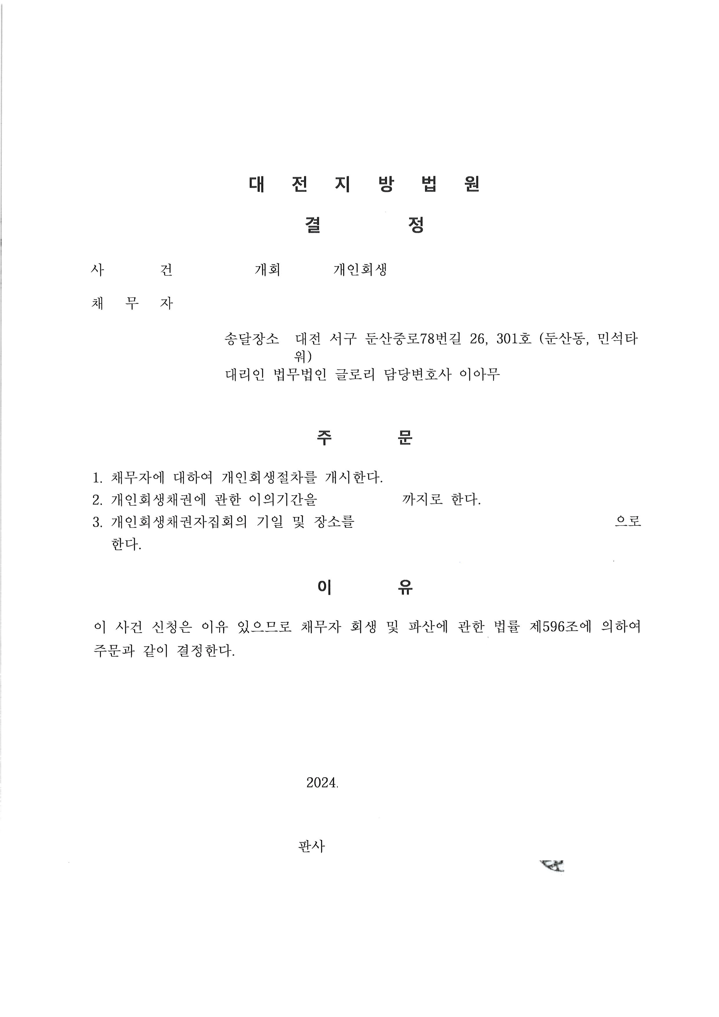 금지명령도 1일이내에 받았습니다. 그러나 박성운(가명)님의 통장내역 도박, 토토 등 사용내역이 많아 입출금액 내역을 소명하는 과정에서 어려움이 있었지만, 도박 등에 사용한 금액이 크지 않다는 점을 어필하였습니다. 위와 같은 박성운(가명)님의 현제의 상황과 변제의 의지에 대하여 법원에 잘 어필함으로써, 결국 총 채무의 29.,4%를 변제하며, 원금의 70.6%를 탕감받는데 성공하였습니다. 고객님께서도 매우 만족하는 좋은 결과로 개시결정을 받을 수 있었습니다. 19년 이상의 경력을 보유한 사무장님과 실무진들이 있는 저희 법무법인 글로리는 고객님들의 만족하는 결과를 얻으실 수 있도록 최선을 다해 노력하고 있습니다.