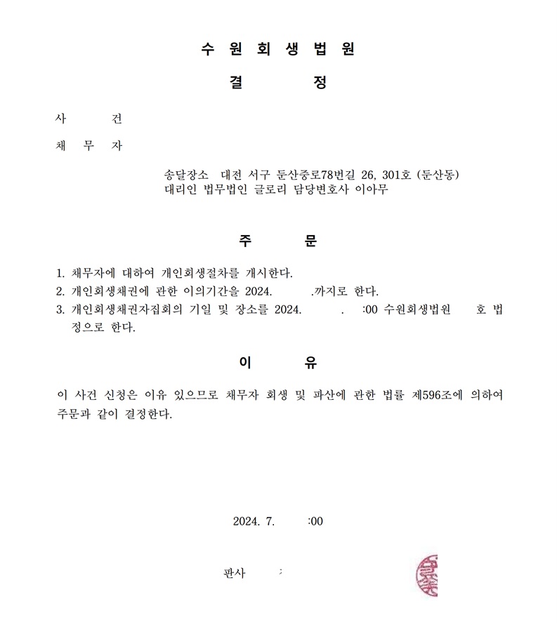 3번째로 신청서 제출 당시 신청인 김승주(가명)님과 원활한 소통으로 완벽한 신청이 진행되어 적은 보정으로 개시결정이 됬습니다.