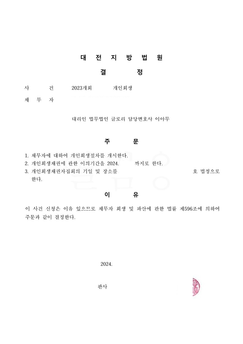 보정 1번으로 개시결정난 사례입니다. 보정의 내용으로는 기본적으로 나오는 것들만 나와서 큰 문제 없이 해결할 수 있던 보정이었습니다. 홈택스나 사이트를 통해서 발급받을 수 있는 서류들이었고, 금원들에대한 소명하는 것 뿐이었어서 쉽고 빠르게 보정을 제출할 수 있었습니다. 그로인해 보정권고 1번으로 개시결정을 받을 수 있게 도와드렸습니다.