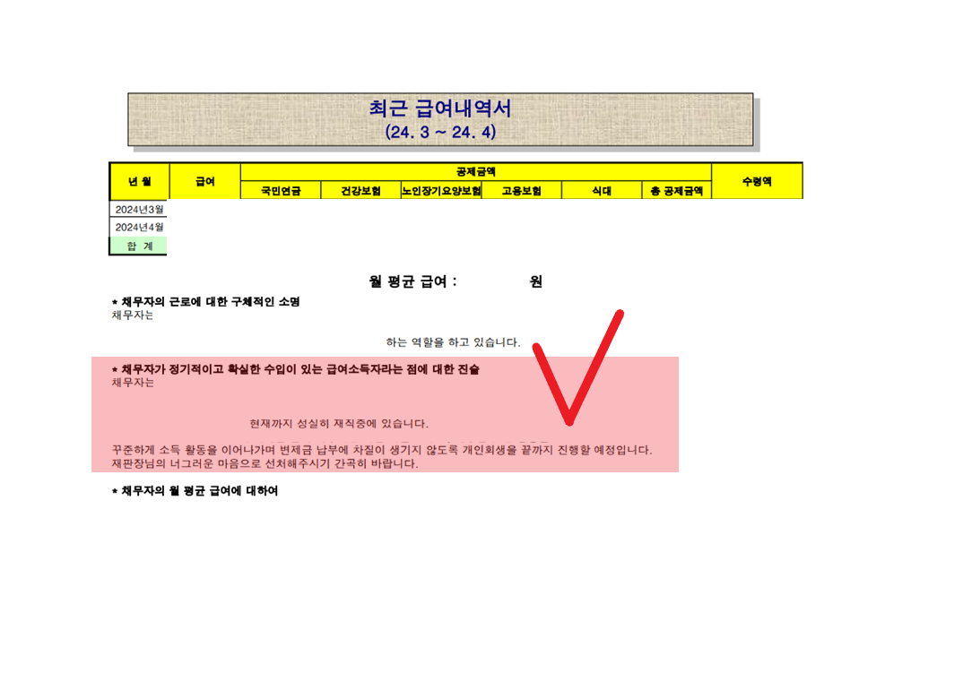 이에 법원에서는 영모씨를 정기적인 소득이 있다고 보기 의심스럽다며, 이를 소명하라는 보정이 나왔습니다. 이에 저희 법무법인 글로리에서는 영모씨의 2개월치 급여내역을 도표로 정리하여 제출하였고,