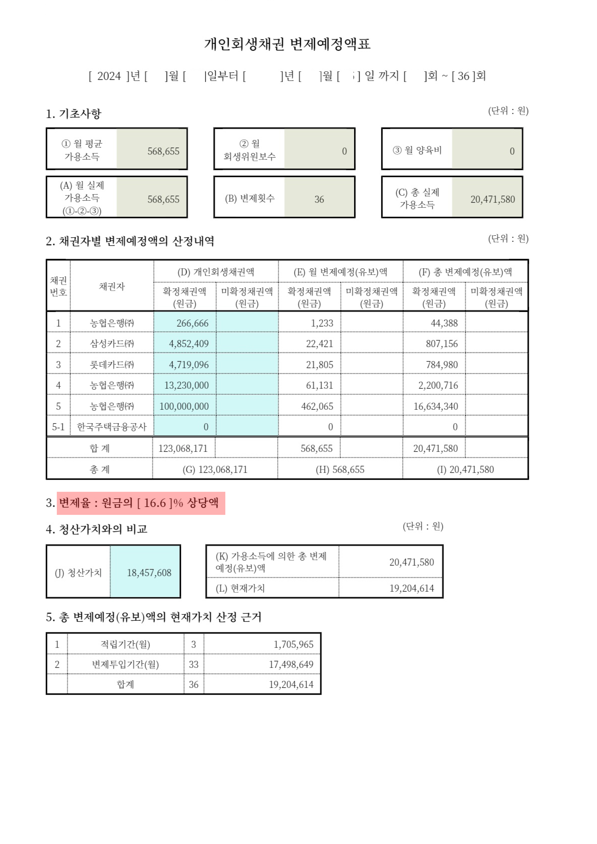 월 변제금액 568,655원/ 변제율 16.6% / 추가생계비 10만원 인정