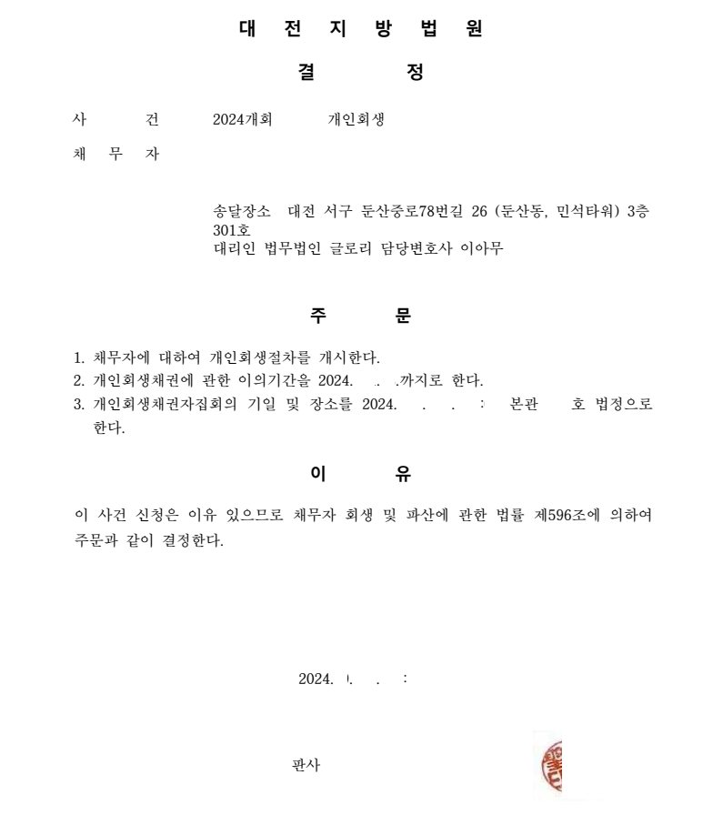 월 변제금 361,404원의 금액으로 41.3% 탕감 받으며 고객님도 매우 만족하는 개시결정을 받아냈습니다.
