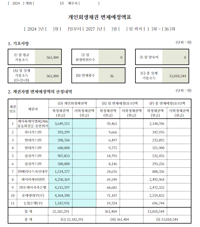 1. 신청인은 총 채무액에 50%가량 되는 청산가치를 반영하였지만 적당한 변제금액으로 문제없이 신청서를 제출했습니다.