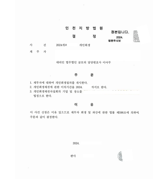 이렇듯 저희 법무법인 글로리에서는 다양하고 많은 사건을 통하여 고객님에게 최대한 유리하게 사건을 진행하며, 빠르고 친절한 소통을 통하여 좋은 조건의 개시결정까지 함께합니다.