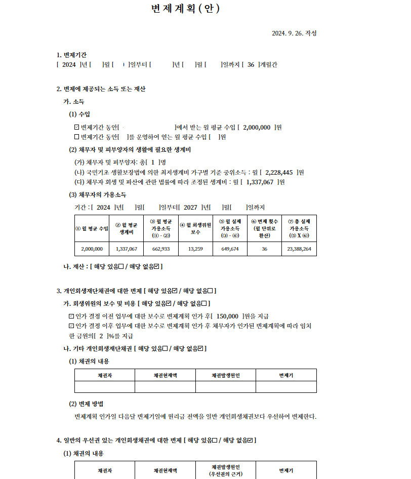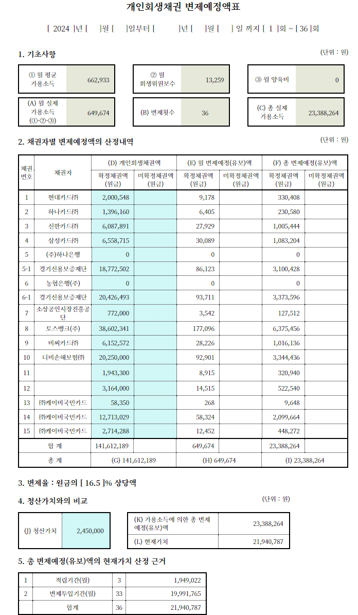 총 변제금 23,388,264원, 변제율 16.5%라는 아주 좋은 조건으로 개시결정을 받을 수 있었습니다.