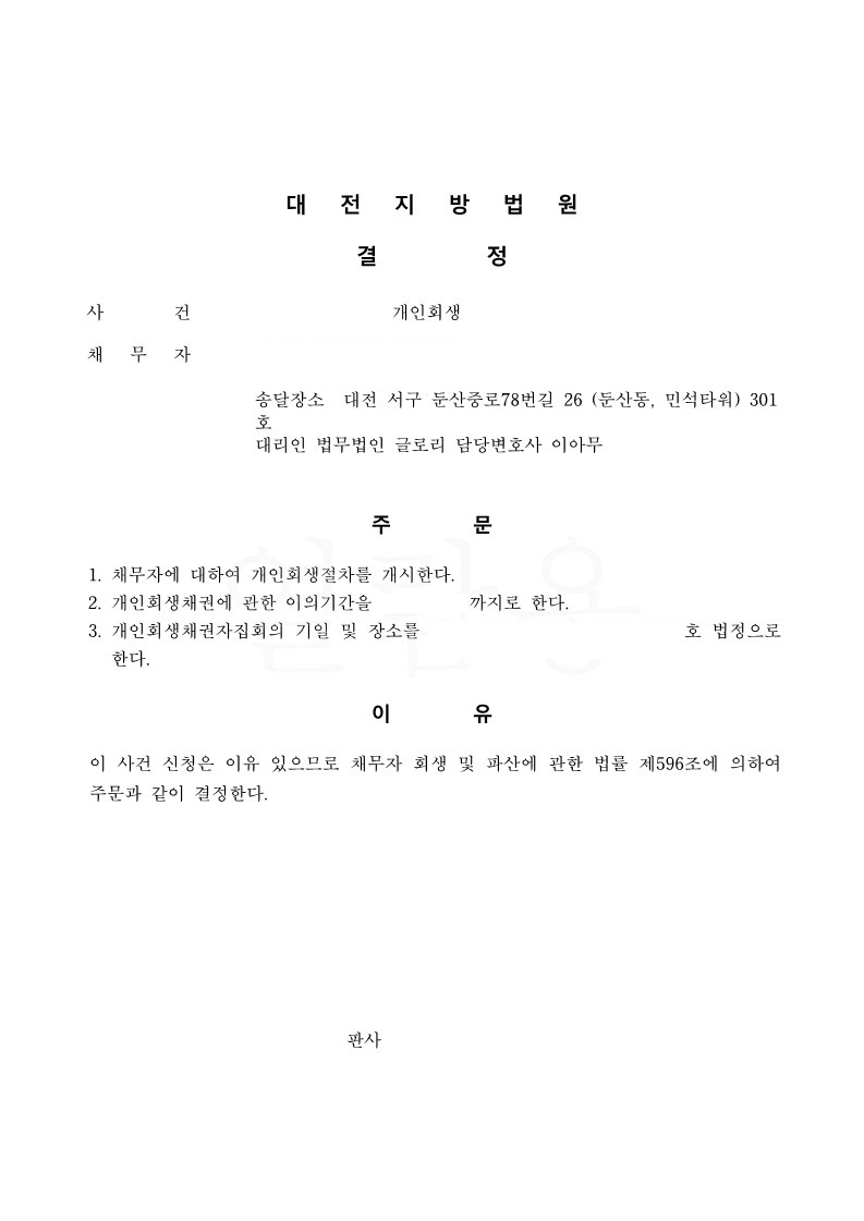 이번에 소개드릴 저희 고객님은 대학교 졸업 후 취업준비를 하다가 코인 노래방을 차리게 되었습니다. 여유자금이 없었기에 가게를 차릴 때 대출을 받아 차리게 되었습니다. 하지만 코로나19 펜데믹을 겪으면서 많이 어려워지자 결국 가게 운영을 위해 또 대출을 받아 사용했습니다. 최근 코로나가 끝난 뒤에는 다시 가게가 잘 될 거라고 생각했지만, 경기침체로 인해 가게 운영은 여전히 어려웠습니다. 8년 가까이 가게를 운영하면서 성실이 대출금을 상환화고 이자 납부를 하였지만 그럼에도 감당하기 힘들어 하셨습니다. 그러던 중 저희 법무법인 글로리를 찾아와주셨고 개시결정을 받을 수 있게 도와드렸습니다.