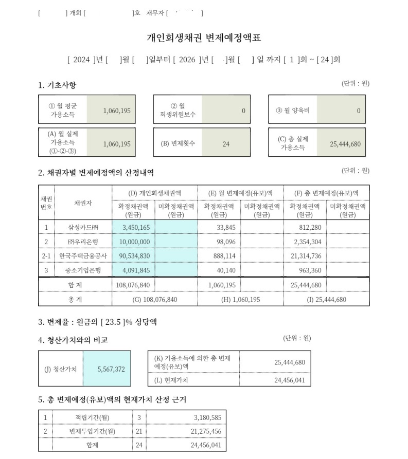 1. 24개월의 회생진행이 어렵고, 36개월로 진행하라는 보정권고를 받았으나 신청인은 변제금을 올려서라도 짧은기간으로 회생을 마무리하고 싶어 보정권고 제출 시 사유서와 진술서를 제출하여 24개월로 진행을 도와드렸습니다.