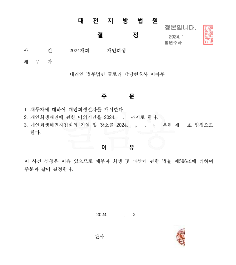 1. 보정으로 신청인의 신청서 제출 당시 변제율이 너무 낮아 변제금을 올리라는 보정권고가 있었으나 법원과의 조율로 20%가량의 변제금으로 개시결정을 받았습니다.