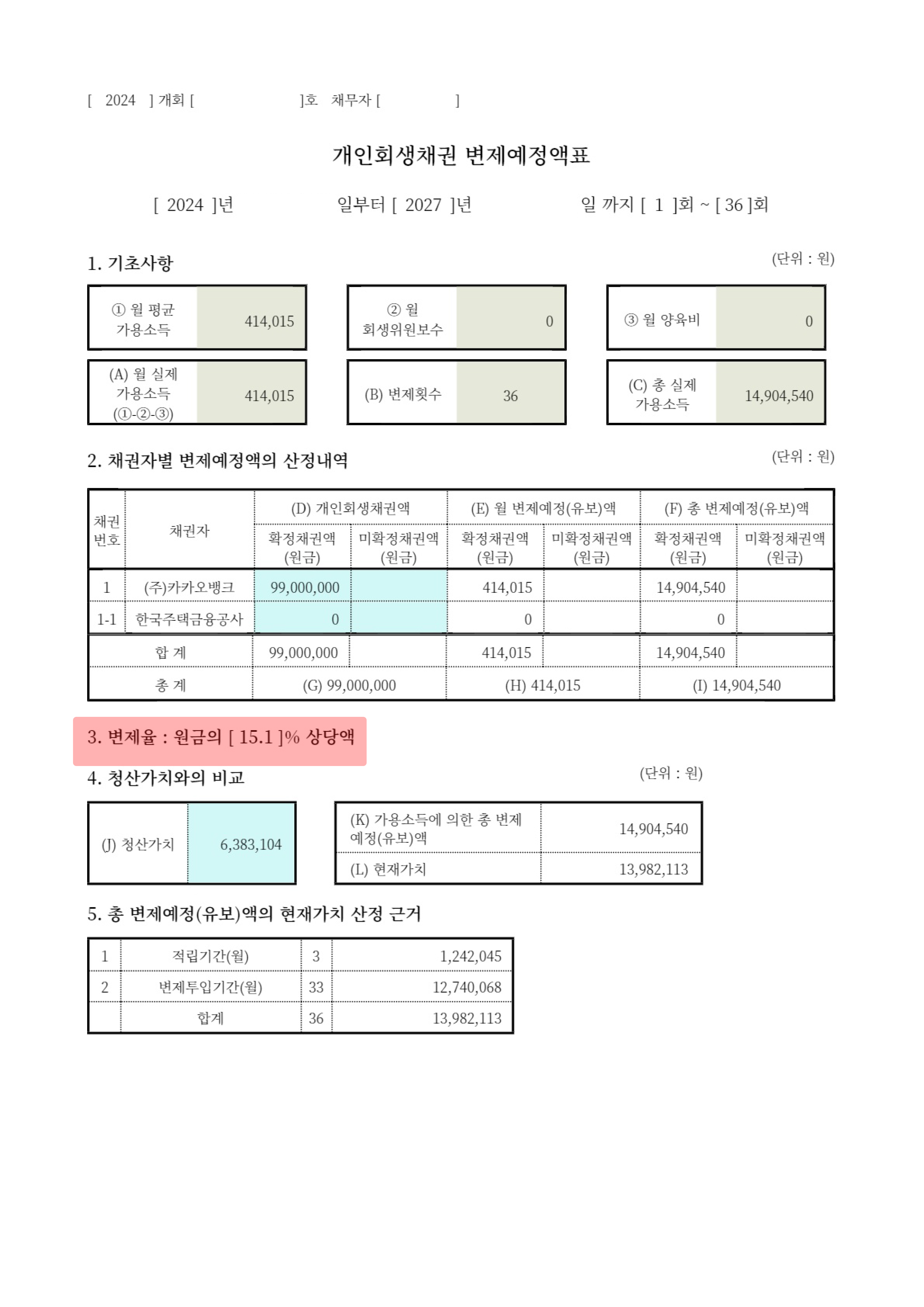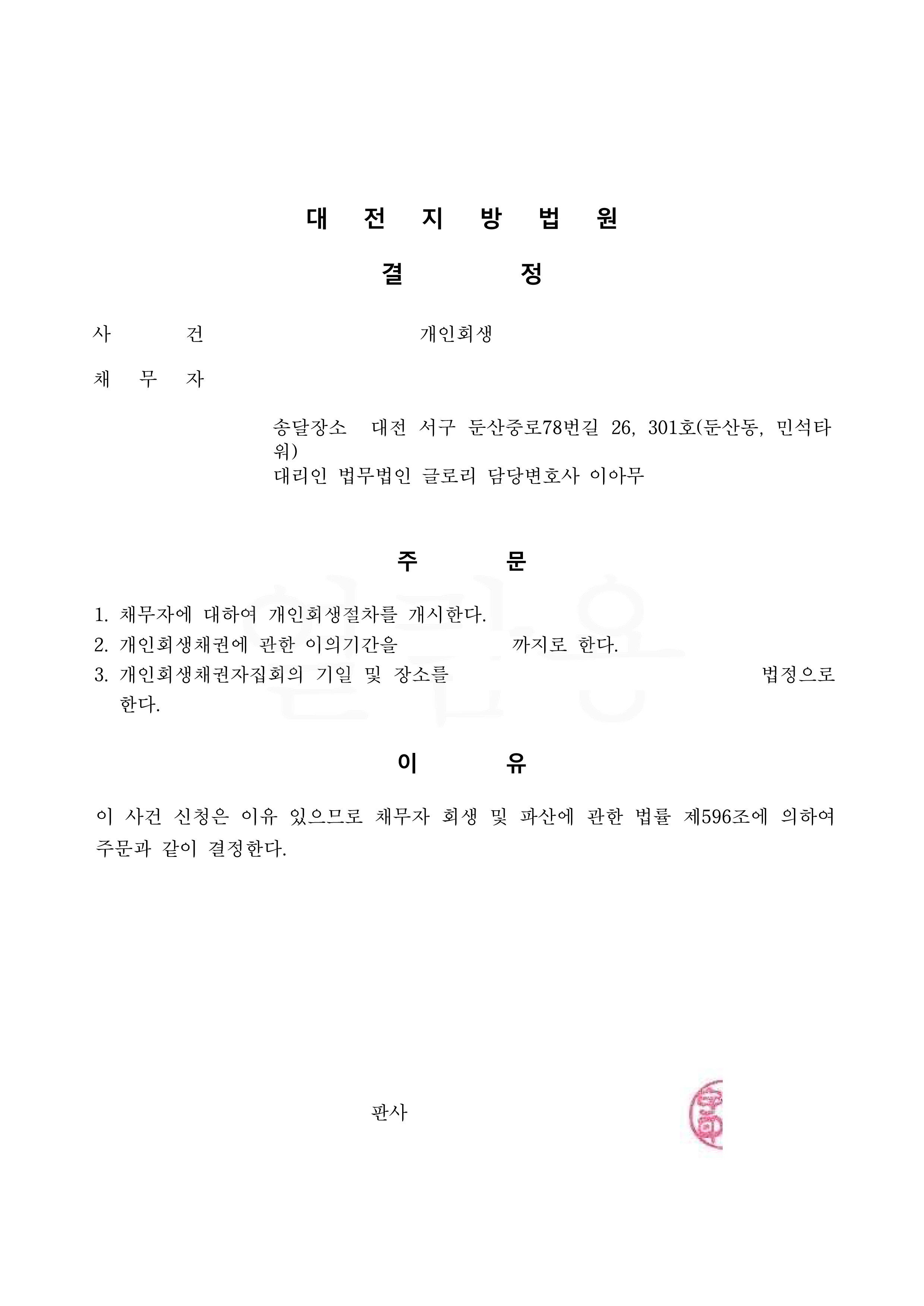 그로 인해 간단한 보정을 거쳐서 총 채무액의 85%를 탕감 받는 좋은 조건으로 개시 결정을 받아드렸습니다.