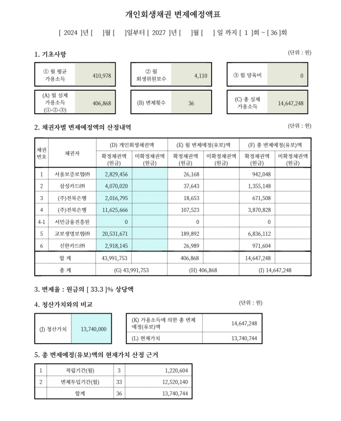법원에서 요청하는 그대로 청산가치로 반영하여 제출하면 과도하게 청산가치가 잡혀 높은 월 변제금에 개인회생 제도를 진행하는 데 있어 어려움을 겪게 됩니다.