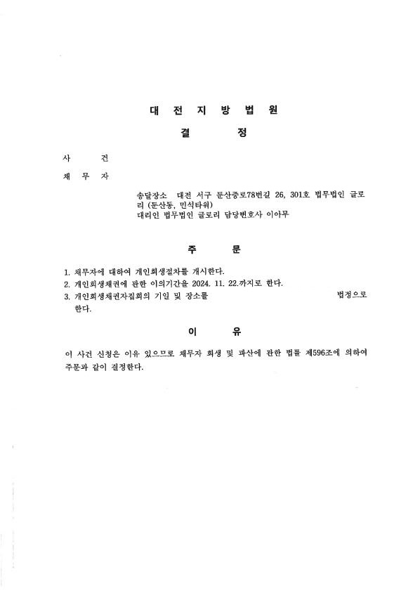 단 한번의 보정 없이 신청서를 넣고 몇 개월 후 바로 개시결정을 나게 도와드렸습니다. 전세사기 피해자는 개인회생 변제기간 최소인 36개월이 아닌 24개월로 진행을 도와드렸고, 고객님께서 만족하는 변제금과 변제율을 만들어드렸고 탕감률은 70.1%로 반 이상을 넘게 탕감 받게 도와드렸습니다. 저희는 상담시부터 신청서를 넣기 전까지 고객과의 여러번의 소통을 하여 의견을 주고 받으며 충분한 시간을 통해 고객에게 최대한 맞는 솔루션을 제공하고있습니다. 고객님께서는 빠른 개시결정을 받을 수 있게 되어 기쁘셨다고 저희에게 감사하다는 말씀을 남겨주셨습니다.