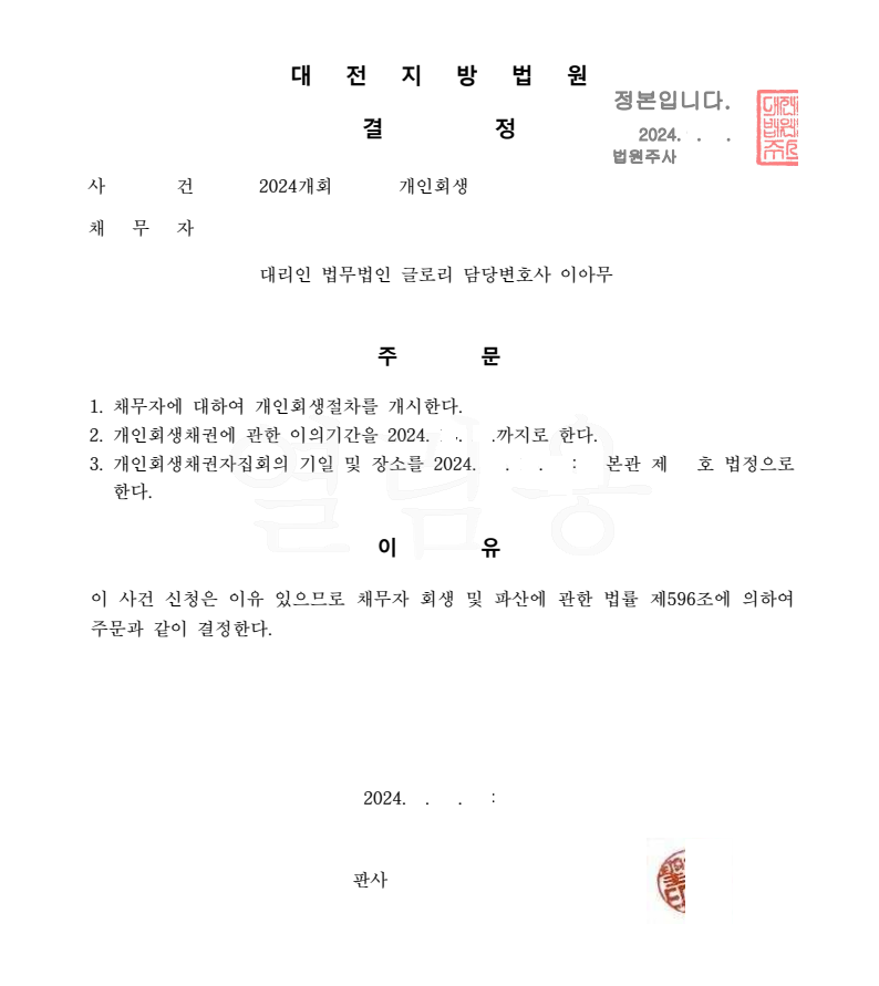 3. 법원의 요청에 긍정적으로 반응하여 무보정으로 개시결정을 받았습니다.