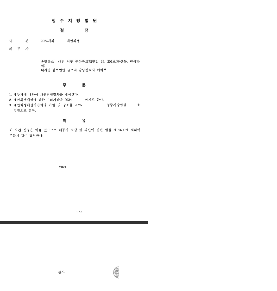 의뢰인과의 소통으로 정확하고 빠르게 보정처리를 하여 개시결정을 받을수 있었습니다.