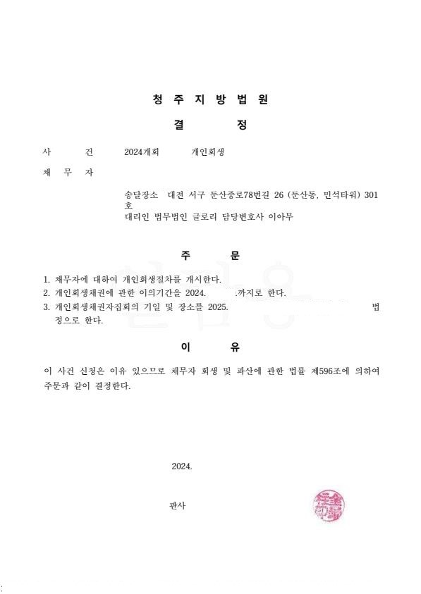 고객님의 경우 개인회생절차를 이미 진행하셨던 경험이 있는 관계로 절차 진행에 있어 어려움이 있었으나, 채무 발생 경위 및 그 사용처 등을 상세히 소명하였고 이에 따라 금지명령 및 개시결정을 받을 수 있었습니다.