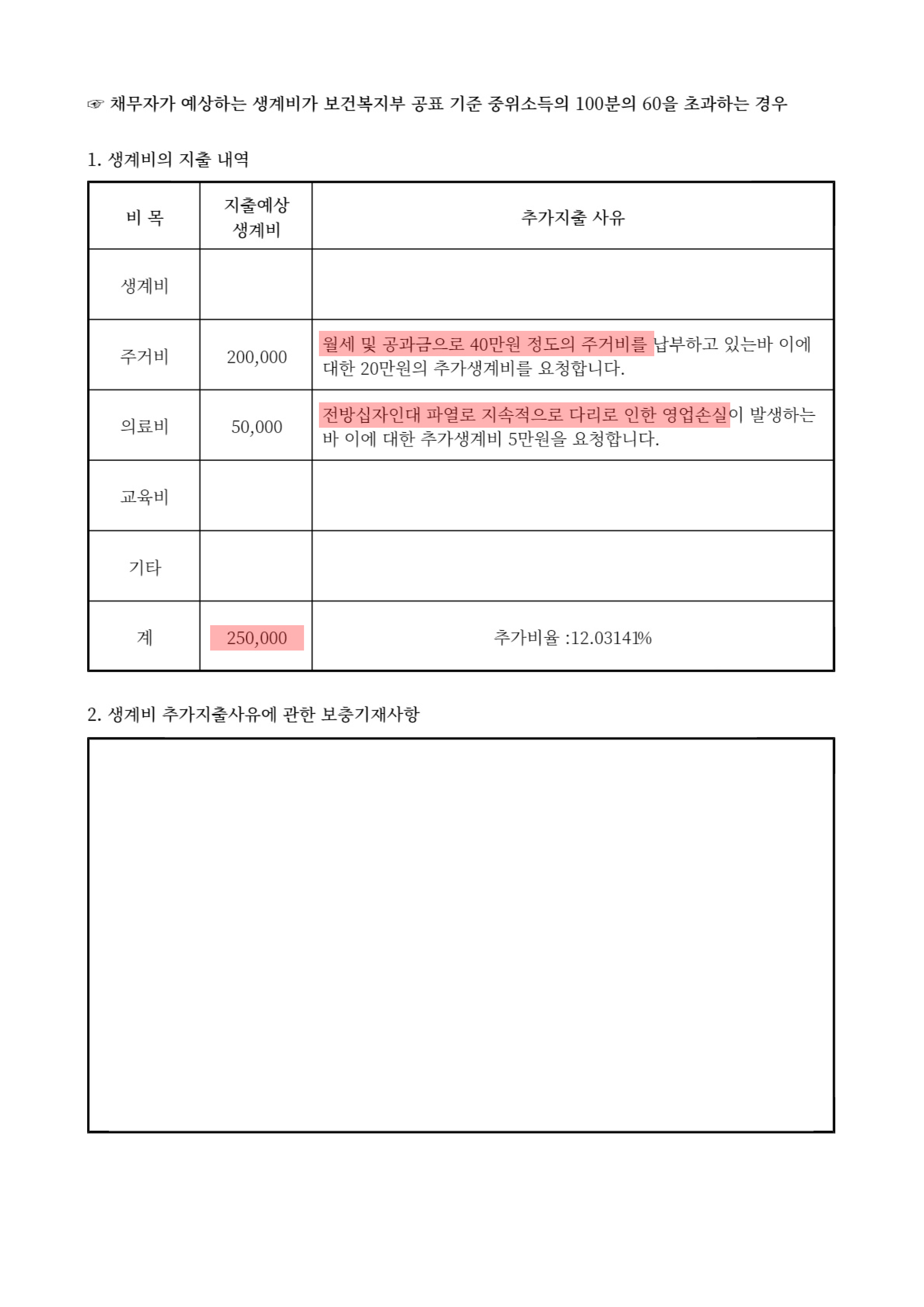 법원으로부터 주거비 및 치료비로 요청했던 추가 생계비 25만 원을 인정받을 수 있었습니다.
