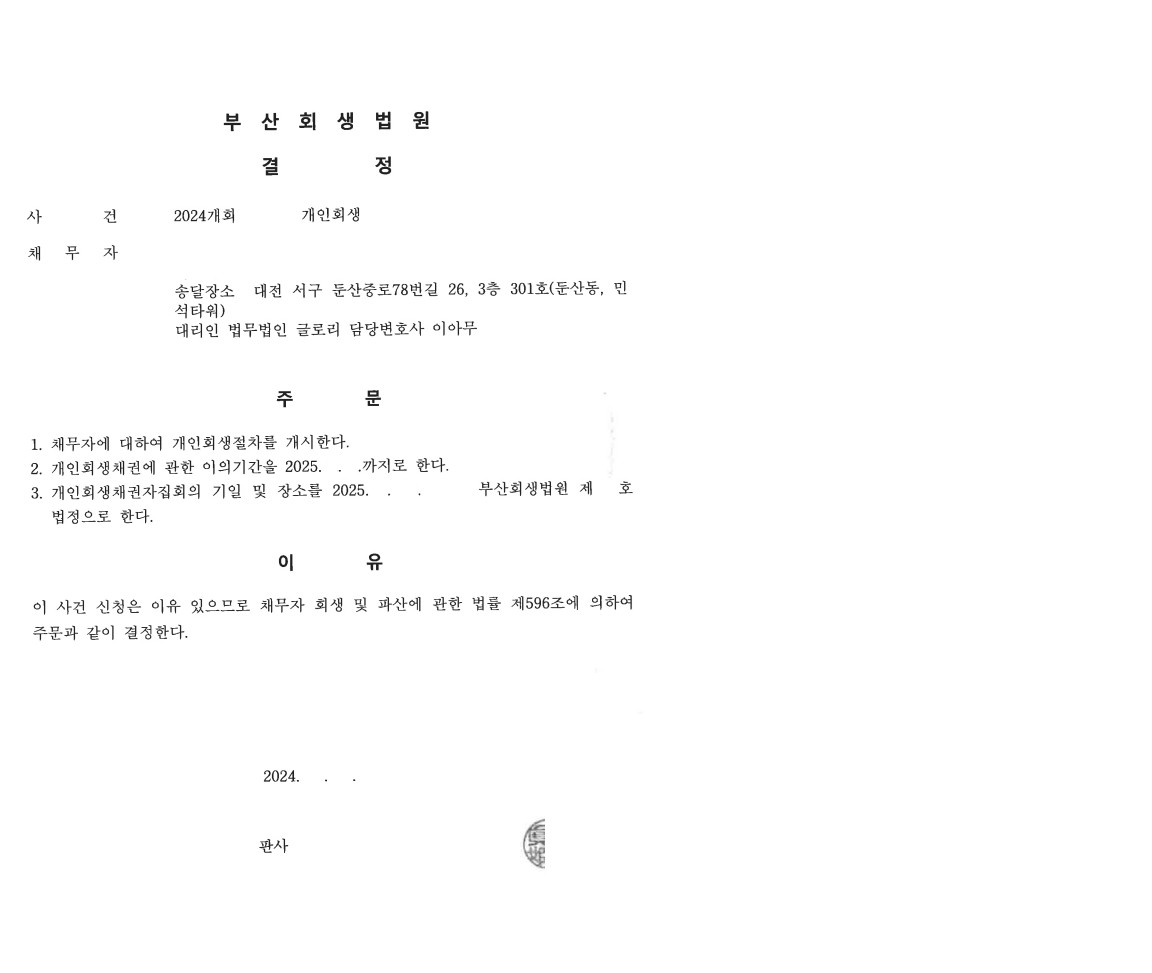 의뢰인과의 소통으로 꼼꼼하고 빠르게 보정처리를 하여 의로인도 만족하는 개시결정을 받을수 있었습니다.