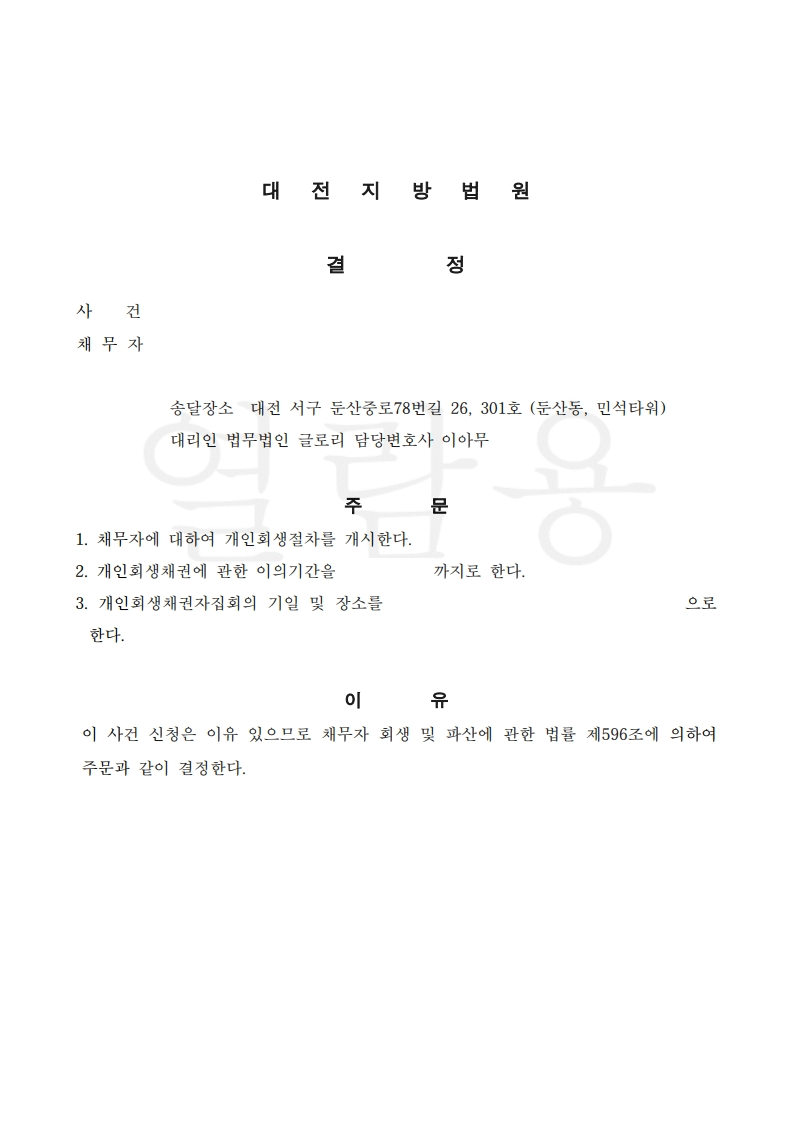 그 결과, 보정없이 개시결정을 받을 수 있었으며, 접수 이후에 본인의 상황이 나아진 것을 느끼시고는 매우 만족하며 지내고 계십니다.