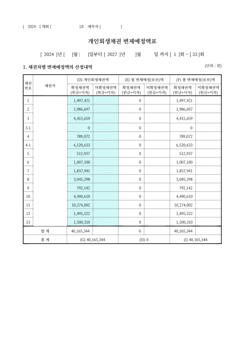 3년이내의 변제기간일 경우 원금+이자의 금액으로 상환하는 변제계획안을 작성하여 제출하였습니다.