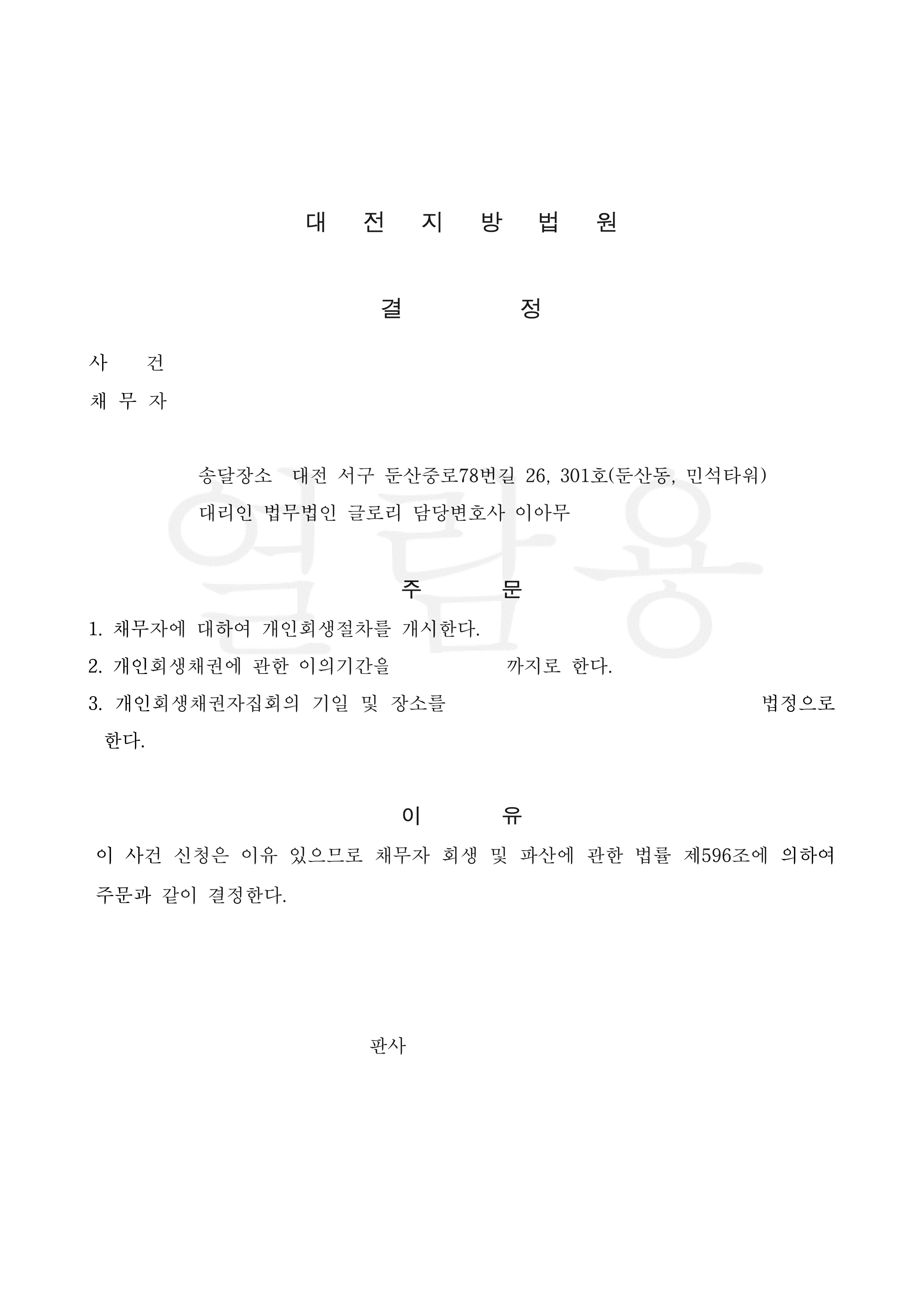 고객님은 한 번의 간단한 보정을 거쳐 총 채무액에 69%를 탕감 받는 좋은 조건으로 개시 결정을 받으실 수 있었습니다.